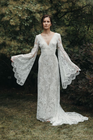 Classic, elegant and timeless, our Lisa gown is like no other! A flattering deep V-neck and gorgeous lace detailing all over. Show stopping dramatic bell sleeves adorn such intricate lace appliqué, we really are in awe of this wedding dress.
