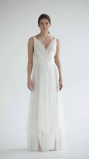 This soft elegant wedding gown is light and ethereal perfect for a bohemian bride. To accompany this beautiful tulle is a wonderfully whimsical cape which glides with the movement of the bride. French lace appliqué defines the waistlines and adorns the back.