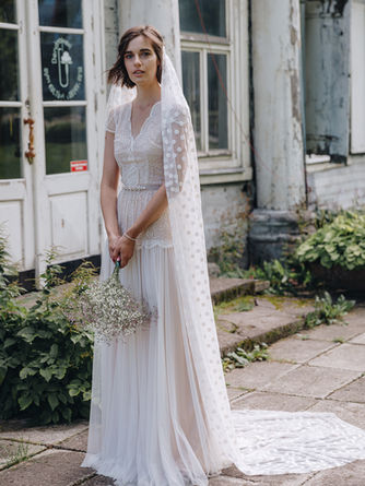 A signature gown by KATYA KATYA, this timeless in style peplum silhouette never fails to remain a classic, with beautifully feminine touches throughout, seen on the scalloped butterfly cap sleeves and soft V-neck front. Unique back detail creates a stylish pattern at the back whilst the soft tulle skirt creates an ethereal aesthetic allowing freedom of movement. Finished with a hand embroidered Swarovski crystal sash belt in nude made in-house in our showroom.