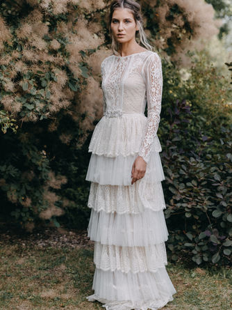 Petal is the perfect combination of a modern yet vintage inspired gown. Fashion forward tulle and lace tiers create a layered skirt adding fun and drama to the bottom. The top is finished in gorgeous long sleeves and a stunning mixture of two French laces creating a romantic look. The waistline is emphasised by hand stitched Swarovski embroidery to finish the look of this gown.