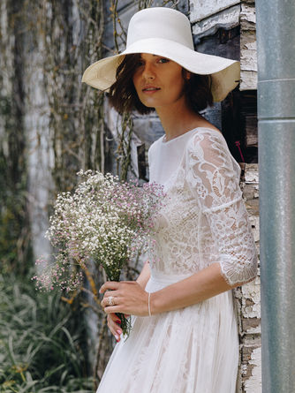 Beautiful fine French lace adorns Plume which is brought to life by a nude detachable slip highlighting the most detailed parts of this gown. Flattering scalloped ¾ length sleeves sit neatly on the upper arm at the end of a unique sheer tulle chest piece, whilst the gathered skirt gives freedom of movement & comfort all round. Brought to life by a detachable tulle skirt which provides extra volume as well as giving an enchanting overall look.